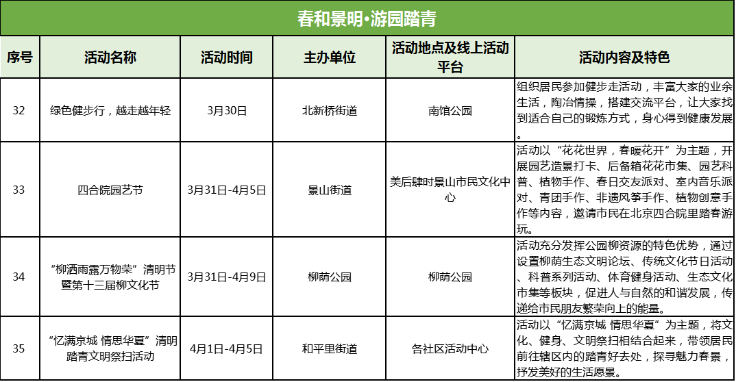 春暖花开,天清地明。清明节期间,全区广泛组织开展春季踏青、园艺科普、体育健身等活动,将文化、健身、文明祭扫相结合,用更加健康文明的方式寄托哀思,倡导新风。如柳荫公园举办“柳洒雨露万物荣”清明节暨第十三届柳文化节,结合柳荫生态文明论坛、清明科普展和柳文化科普展、体育健身活动、生态文化市集等多种形式,传递给市民朋友繁荣向上的能量。此外,景山街道举办四合院园艺节,以室内弦乐拉开春日序曲,在绿植花艺中品味东方雅韵。和平里街道、北新桥街道等也纷纷开展绿色健步行活动,带领居民前往辖区内的踏青好去处,抒发美好的生活愿景。