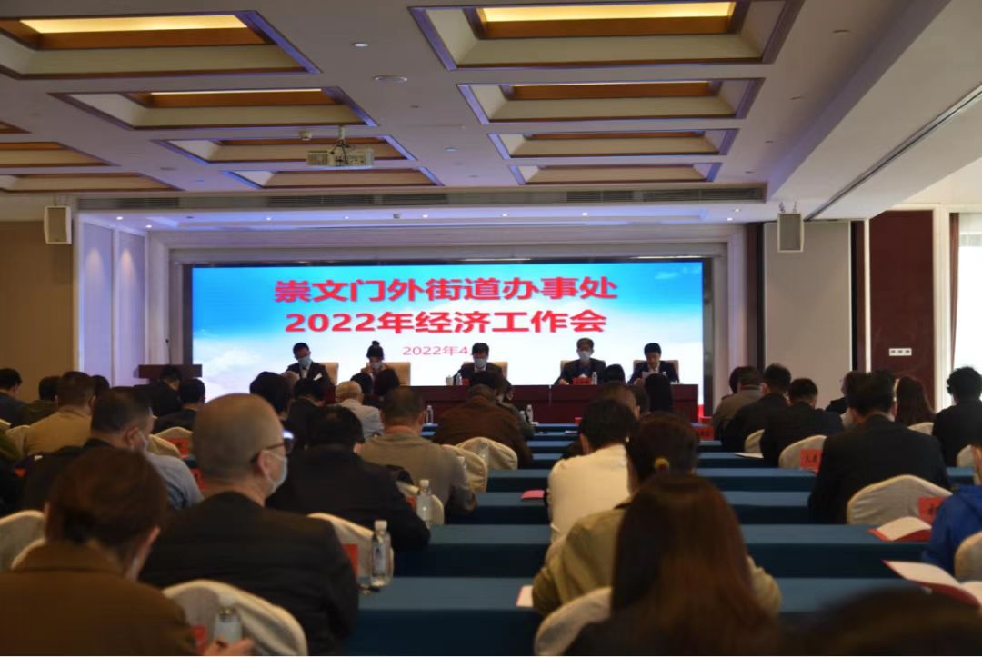 4月15日下午,崇外街道召开2022年经济工作会,进一步凝聚合力,共谋发展,为建设“宜居宜商 崇文争先”新崇外贡献力量。街道党工委书记余海民、党工委副书记吴金山、区发改委副主任王新刚、区商务局副局长于倩、办事处副主任贾峥、崇外商会会长丁一出席会议,街道领导班子、区管干部、科级干部,派出所、市场监管所、税务所、辖区重点企业、商圈企业、楼宇物业负责人等参加会议。