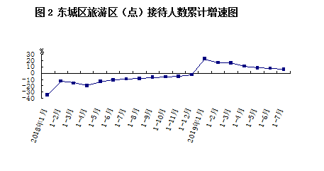 2019年1-7月,东城区18家A级及以上旅游区(点)和其他主要旅游区(点)累计接待游客4258.1万人次,同比增长6.5%。