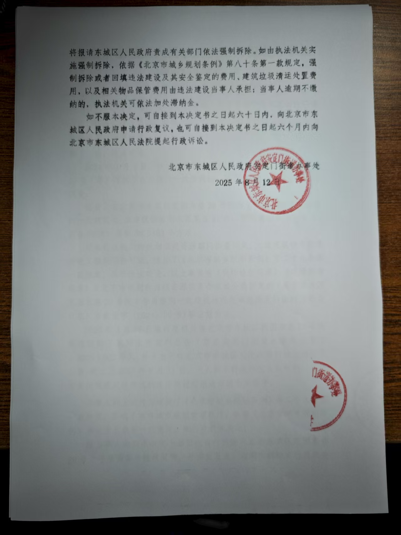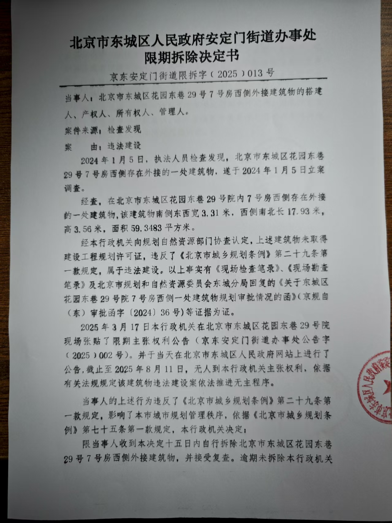 北京市东城区安定门街道关于花园东巷29号7号房西侧外接建筑物的限期拆除违法建设事先告知书