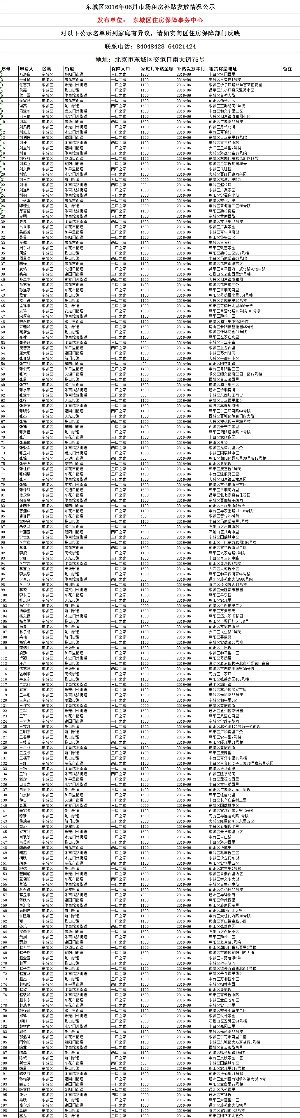 东城区2016年06月市场租房补贴发放情况公示